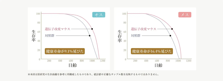 ワシントン大学の今井眞一郎教授の研究チームは、このSIRT1の働きを強化した遺伝子改変マウスを用いて実験を行い、老化に伴う症状や疾患の発症が遅れたことを確認しました。その結果、メスでは約16.4%、オスでは約9.1%健康寿命が延びたとされています。*8